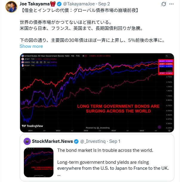 米国や日本を含む先進国が悩まされているのが 国債利回りの急騰 です。こちらのXポストは、その問題を分かりやすく伝えています。